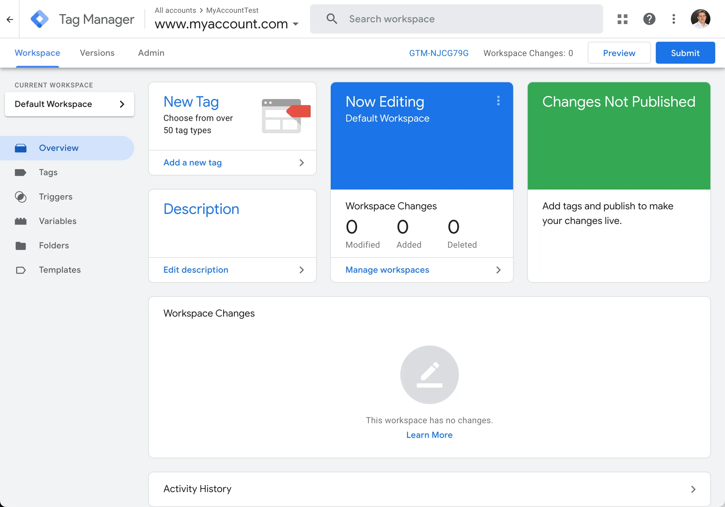 Save your changes and go back to your container. You should now see both the template and the newly created tag.